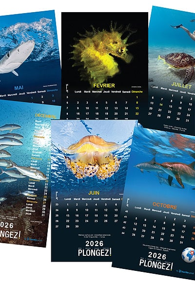 Une sélection de photos sous-marines, papier épais et durable, pelliculage brillant, mode chevalet, soit 24 photos (2 par mois – recto/verso)