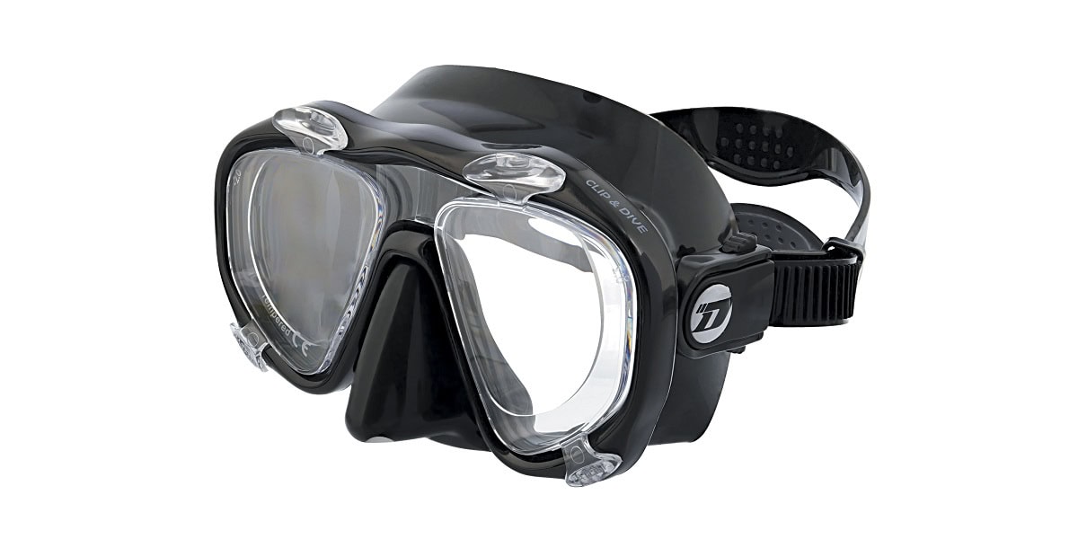 Le masque Clip & Dive de l’opticien Demetz est un masque polyvalent offrant un large champ de vision. Il est disponible en silicone noir ou transparent et a été conçu pour recevoir les clips optiques qui se montent et se démontent directement et aisément sur la face du masque. Ces clips sont parfaitement fixés et disponibles pour les myopes (- 2,00 à – 6,00) et les presbytes (+ 1,5 à + 3,00). Gros avantage : ils peuvent être différents sur chaque œil pour une correction optimale.
