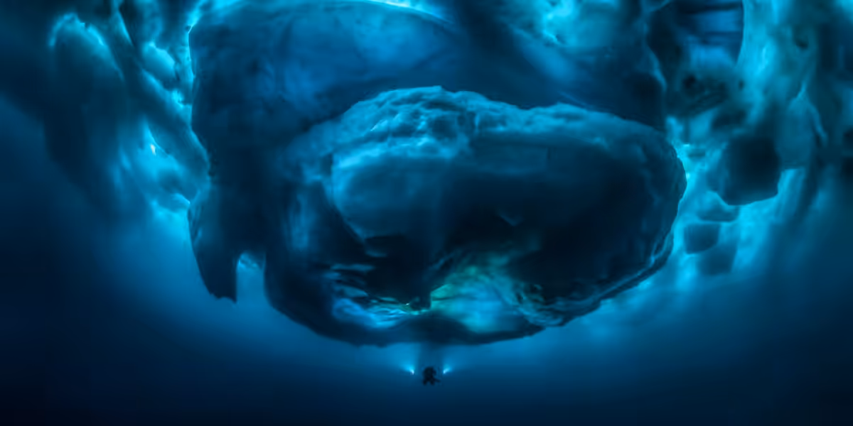 “Cet iceberg a été photographié dans l’est du Groenland. La température de l’eau dans cette région arctique était de -1,8° C. Tous les plongeurs doivent porter une combinaison étanche ainsi que des sous-vêtements épais pour ne pas être mouillé et supporter le froid. De plus, la sécurité est très importante, car les plongées se déroulent sous un plafond de glace fermé avec seulement de petites ouvertures par lesquelles les plongeurs peuvent entrer et sortir.”