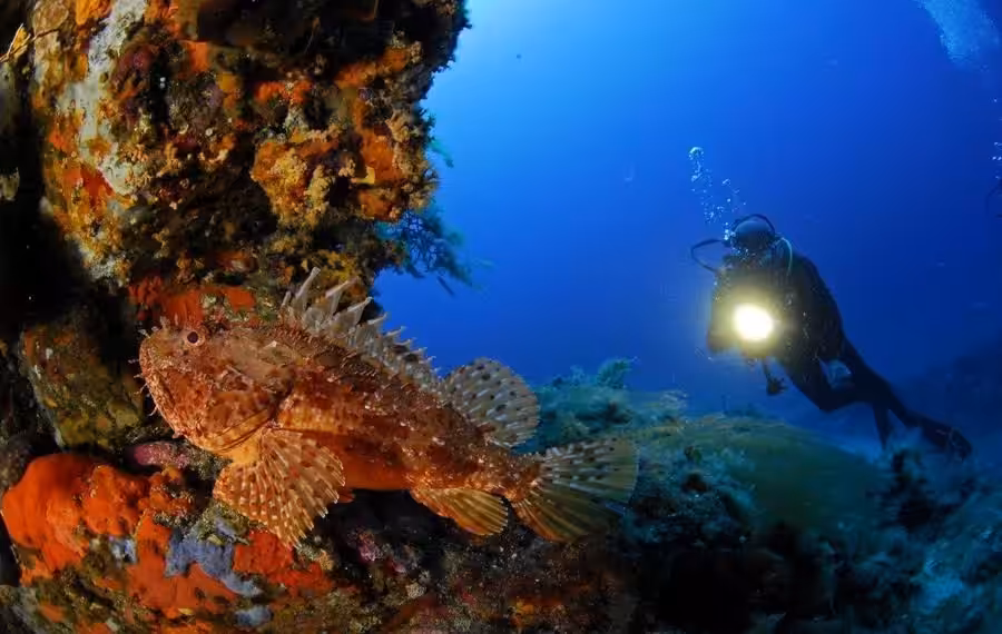 Souvent confondu avec les autres rascasses, le chapon (Scorpaena scrofa) aussi appelé grande rascasse rouge, est une espèce du bassin méditerranéen bien connue par les plongeurs. Son nom donné par les anciens romains lui vient de ses épines venimeuses semblables à des piqûres de scorpion.