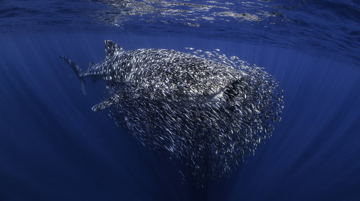 “Pour moi, il s’agit du prédateur et de la proie. Les requins-baleines sont parfois considérés à tort comme des mangeurs de plancton, mais ils sont aussi des prédateurs actifs de bancs de petits poissons. La superbe image d’Ollie est parfaitement synchronisée avec le moment où le requin bondit, passant du statut d’escorte inoffensive à celui de chasseur, la bouche engloutissant sa proie“.