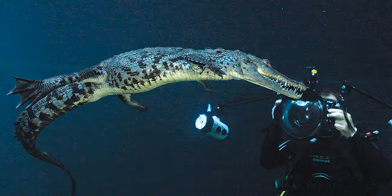 Un plongeur capture l'instant rare d'un crocodile nageant dans les profondeurs, illustrant l'aventure ultime du monde sous...