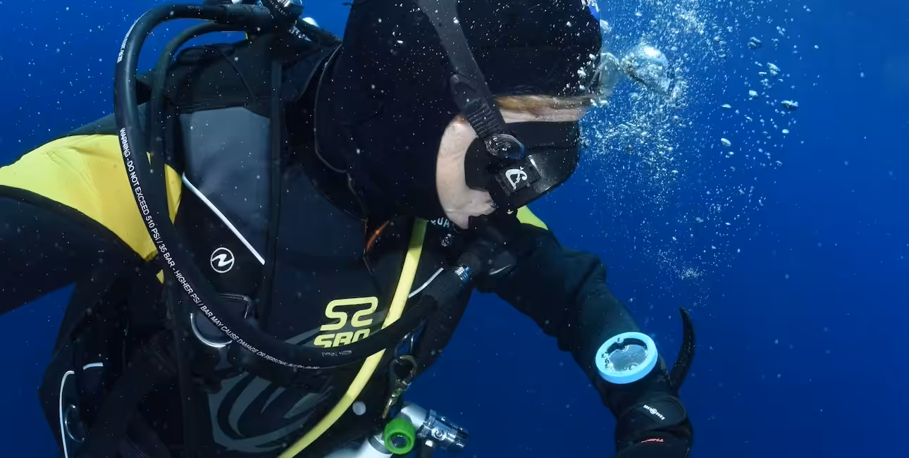 Un plongeur vérifie son ordinateur de plongée en pleine immersion, illustrant l'importance de la sécurité sous-marine.