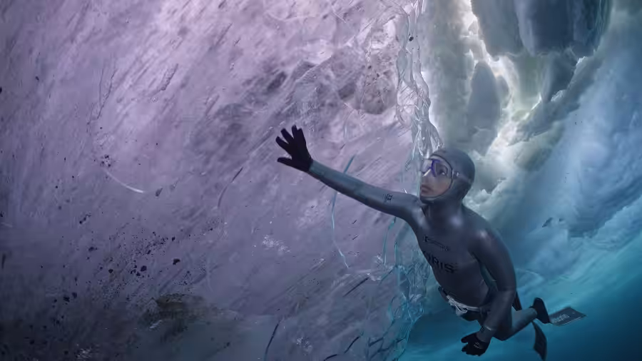 Un film de plongée en apnée sur la recherche du minéral Kimberlite sous la mer gelée à l’est du Groenland.