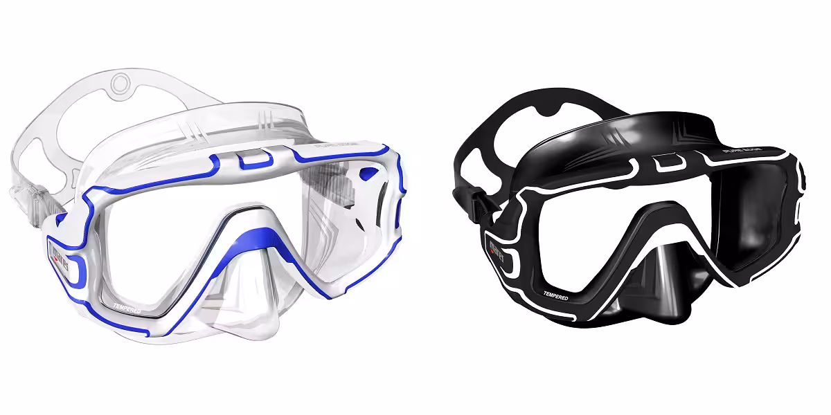 Le masque Pure Edge de Mares joue la carte de l’originalité grâce à son design, l’un des points forts de la marque. Ce mono-verre au cerclage bi-matière est surmoulé sur une jupe silicone très confortable. Les boucles de fixation, intégrées sur le cerclage sont ainsi bien protégées.
