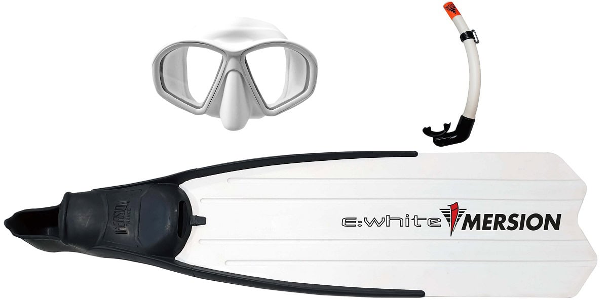 Exit le sempiternel coloris noir et place au blanc pour cet ensemble Imersion qui se compose de palmes chaussantes (36/38 à 44/46) avec voilures de 78 cm conçues pour un usage polyvalent, d’un masque à jupe silicone “soft touch” à petit volume et d’un tuba de section 20 mm à embout silicone.