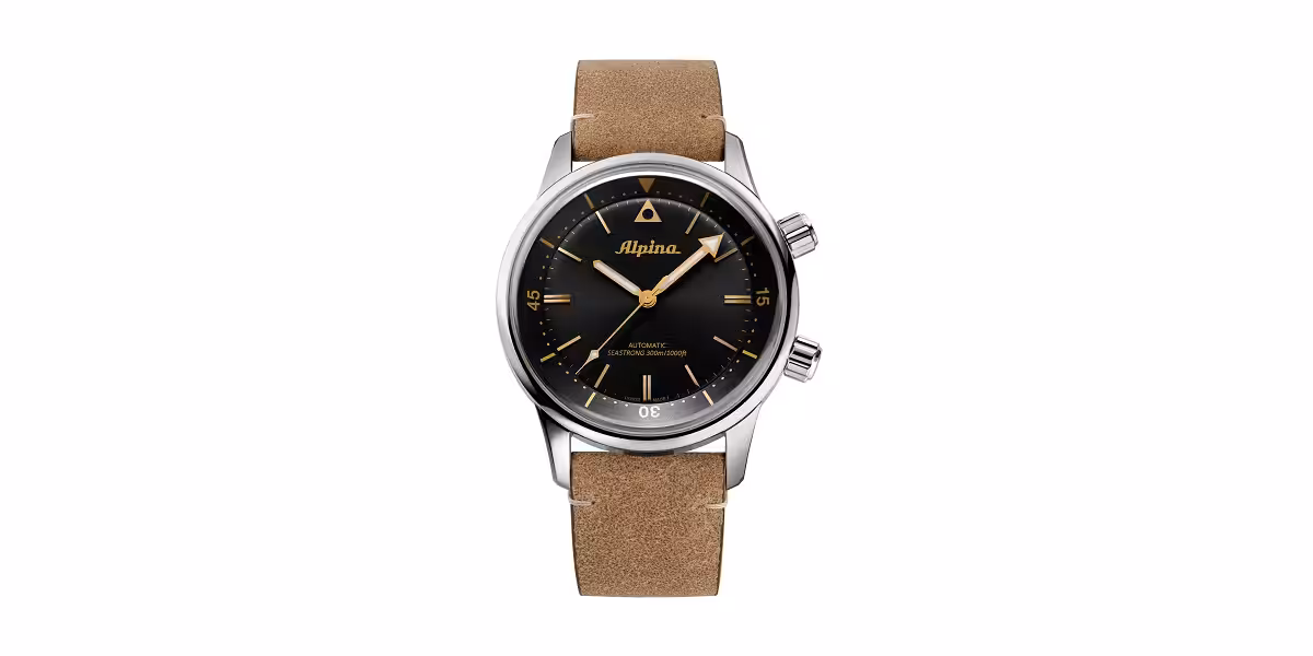 La montre Seastrong Diver 300 Heritage Automatic d’Alpina reprend les codes de la Seastrong 10 sortie en 1969, en conservant sa principale particularité : une lunette tournante interne, actionnée par l’une des deux couronnes du boîtier. Le calibre AL-520 à 26 rubis permet une réserve de marche de 38 heures et l’étanchéité est garantie à 300 m. Livrée avec deux bracelets, l’un en cuir de veau brun, l’autre en caoutchouc, elle pourra donc vous suivre partout.